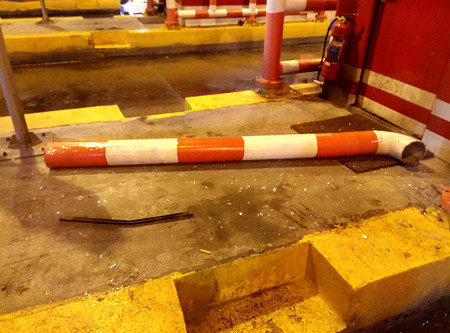 圖為被撞壞的收費崗?fù)?/span> 該車在臺州收費站下高速時,由于車身太長,司機沒察覺到車后半部分所載的傾斜的大米,出收費站時也沒有留意觀看后視鏡,導(dǎo)致傾斜的大米直接把五號收費亭防撞鋼管和收費亭邊窗玻璃撞壞,發(fā)出巨大響聲。收費班長陳幸聞聲后立刻跑到崗?fù)げ炜?/span>,五號車道右前方的防撞欄被撞斷,右側(cè)玻璃破碎,五號崗?fù)?nèi)工作臺上、地面上全是玻璃碎渣,所幸當時崗?fù)?nèi)無人在崗,沒有造成人員受傷。 陳幸一邊通知負責路產(chǎn)勘察賠償?shù)娜藛T到場,一邊協(xié)助司機先將傾斜的幾包貨物卸下,再將車移到外廣場,以免堵住車道,影響四號車道正常通行。最后經(jīng)勘察定損,司機按規(guī)定賠償了500元。 在此,筆者提醒廣大司機朋友,過收費站時一定要慢行,注意四周的收費設(shè)施,并及時檢查所載貨物有無歪斜,既保證自己及他人的安全,也減少不必要的損失。 余娟娟