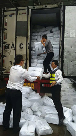 圖為工作人員幫忙搬運掉落的貨物 這輛滿載海鮮的綠農(nóng)車,貨物掉滿車道,司機一人束手無策,當班班長陳豐平在拍完綠農(nóng)照片后,叫上班員林葉輝,一起快速幫助司機一件一件地傳遞貨物。盡管每一袋貨物都十分重,但是他們?yōu)榱藥椭鷰煾堤嵩缯碡浳?,顧不得臉上交織的汗水和雨水?/span> 由于工作人員的幫助,司機離開時一直道謝。他們對司乘人員的主動援助,使得溫嶺西收費所的服務(wù)不單單停留在窗口問候上,還將延伸服務(wù)一直呈現(xiàn)。 陳豐平