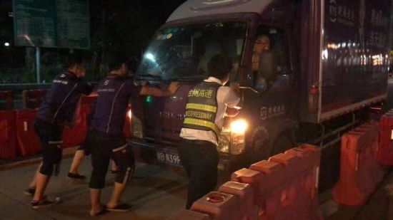 圖為收費員幫助司機將故障車輛推出車道  8月15日凌晨1點多,溫嶺西收費所征費二班安全員在日常巡邏時發現一輛小型貨車停在進口內廣場,在詢問司機后得知車輛因出現故障導致無法發動。安全員當即叫來旁站人員,與兩個司乘人員一起用力,慢慢地將該車推出車道。在婉拒了司機遞香煙的好意后,安全員囑咐司機盡快聯系人員前來解決,后回到崗位繼續工作。
