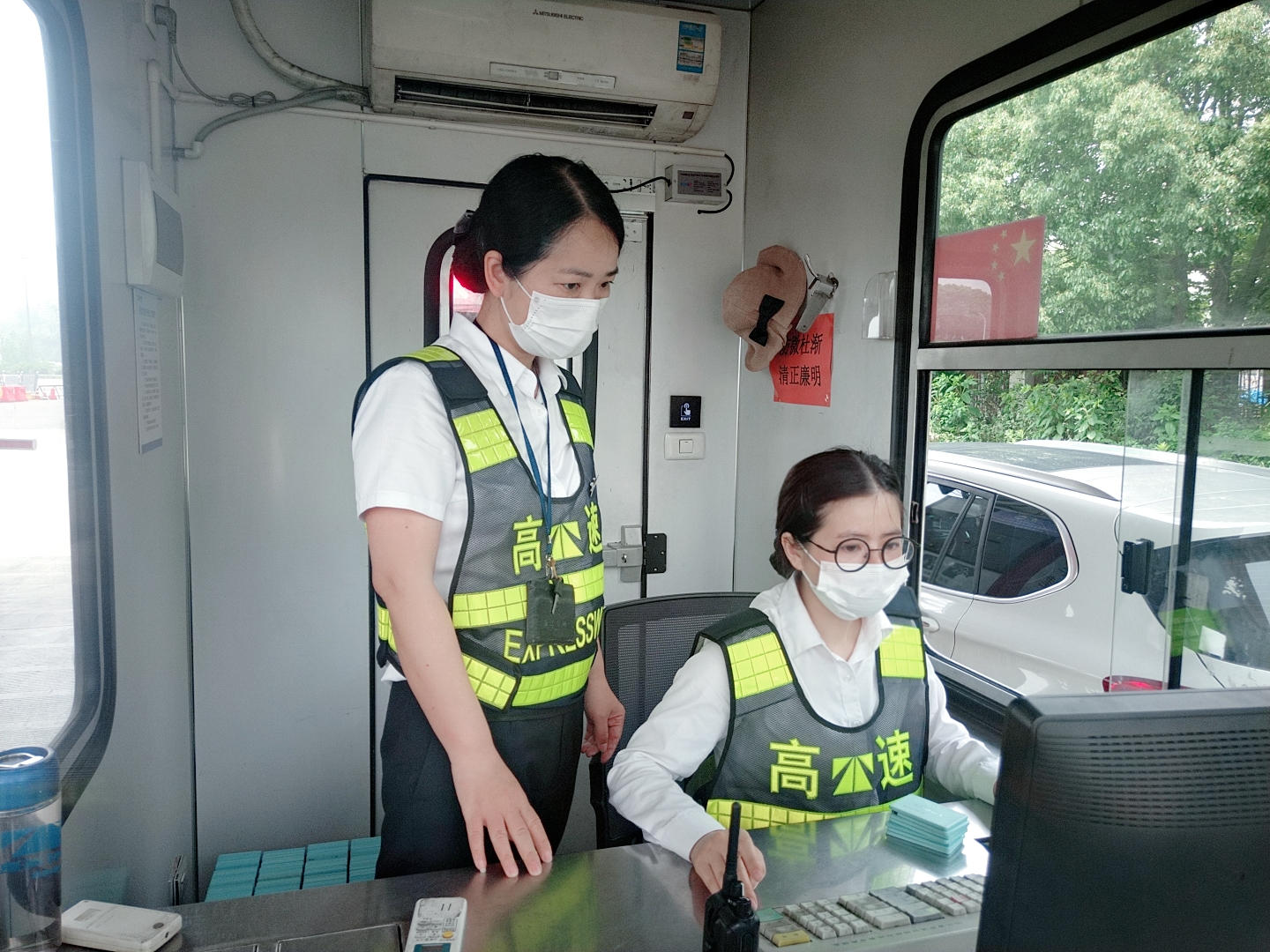 圖為陳軍帶領(lǐng)新員工在崗?fù)づ嘤?xùn) 新員工的到來,為該所注入了新鮮的血液,增添了青春活力。為了讓新員工能夠快速“入鄉(xiāng)隨俗”,盡快適應(yīng)收費(fèi)站工作環(huán)境,順利完成角色轉(zhuǎn)換,當(dāng)日他們就跟著資深班長(zhǎng)陳軍學(xué)習(xí)相關(guān)業(yè)務(wù)知識(shí)。