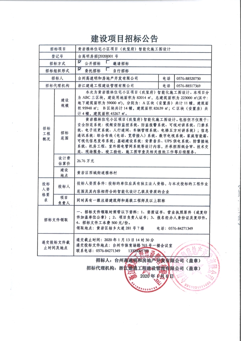 黃巖雅林住宅小區項目(玖璽府)智能化施工圖設計招標公告