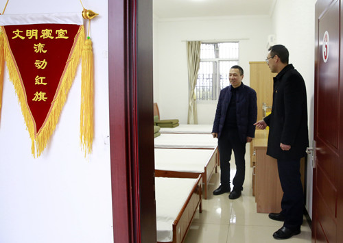 圖為公司總經(jīng)理張建平在員工宿舍查看